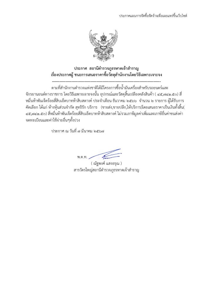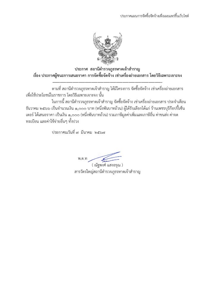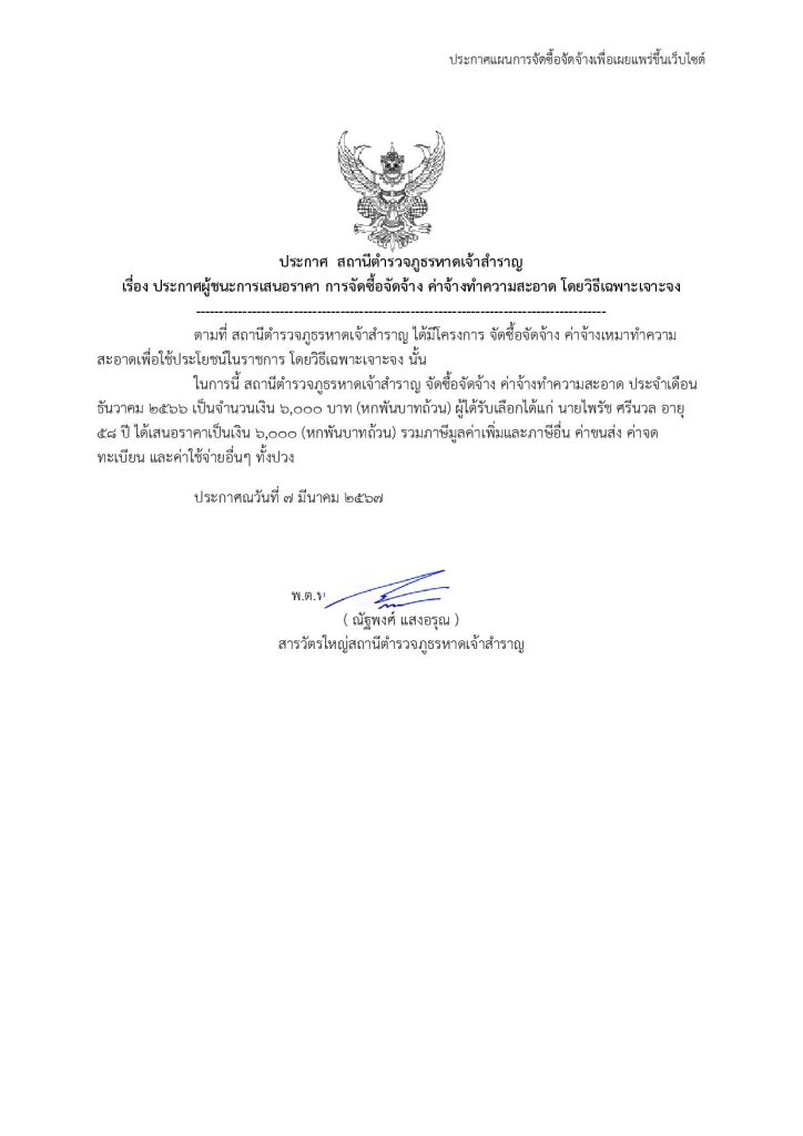 ประกาศสถานีตำรวจภูธรหาดเจ้าสำราญ เรื่อง ประกาศผู้ชนะการเสนอราคา จัดซื้อจัดจ้าง โดยวิธีเฉพาะเจาะจง ประเดือน ธ.ค. 66จำ