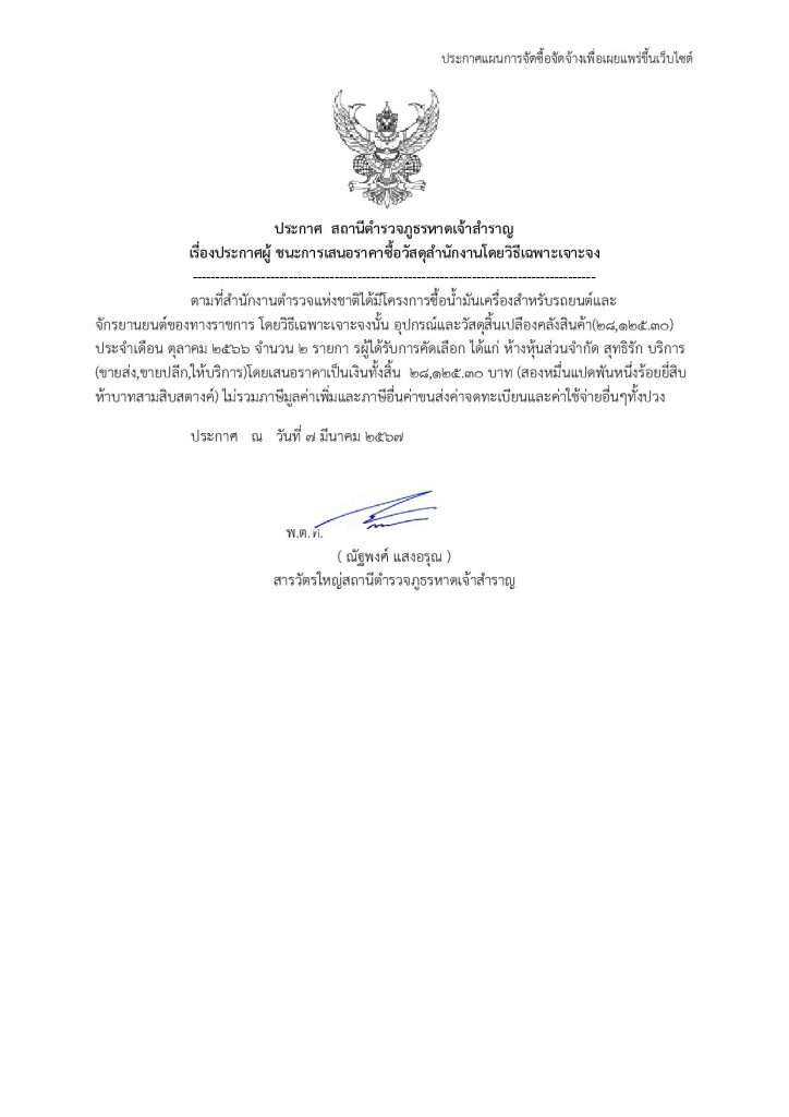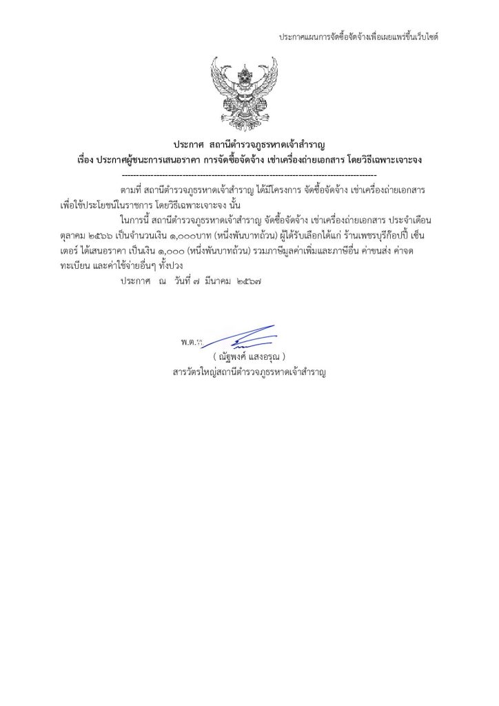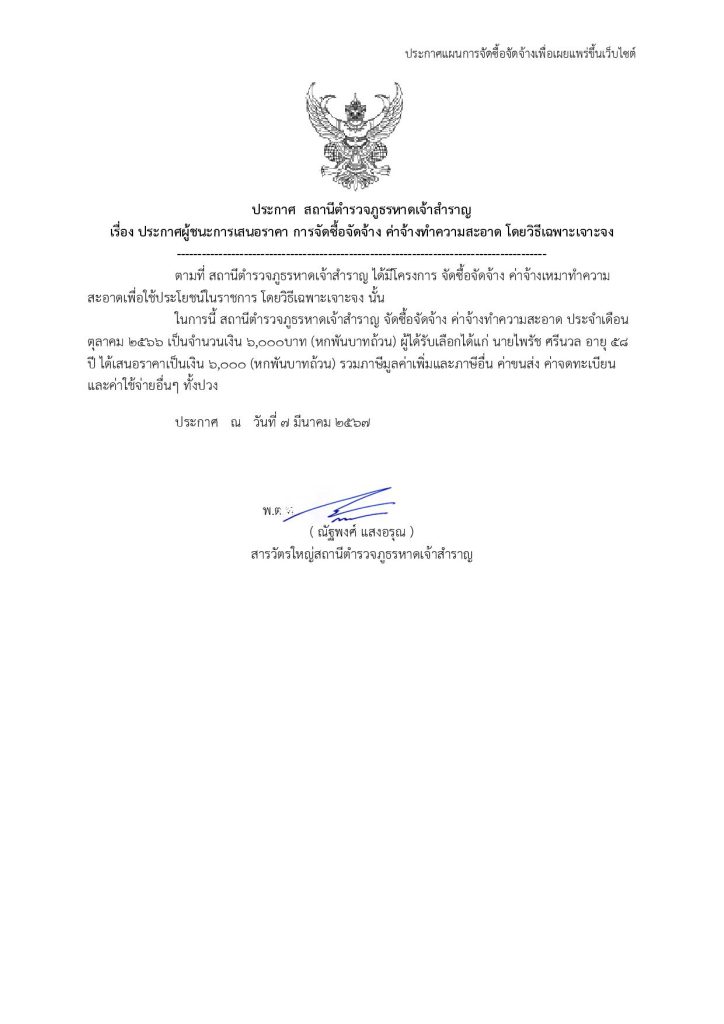 ประกาศสถานีตำรวจภูธรหาดเจ้าสำราญ เรื่อง ประกาศผู้ชนะการเสนอราคา จัดซื้อจัดจ้าง โดยวิธีเฉพาะเจาะจง ประจำเดือน ต.ค. 66 27 มีนาคม 2567 โดย krissada watsawang / ไม่มี
